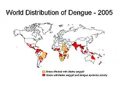 O vírus da dengue é um arbovírus da família Flaviviridae, gênero Flavivirus, que inclui cinco sorotipos: DENV-1, DENV-2, DENV-3, DENV-4 e DENV-5[1][2], causador da dengue. A infecção por um deles dá proteção permanente para o mesmo sorotipo e imunidade parcial e temporária contra os outros três. A dengue tem, como hospedeiro vertebrado, o homem e outros primatas, mas somente o primeiro apresenta manifestação clínica da infecção e período de viremia de aproximadamente sete dias. Nos demais primatas, a viremia é baixa e de curta duração.[3]