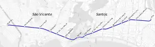 Atualmente, atende somente os municípios de Santos e de São Vicente, no entanto os municípios de Cubatão e de Praia Grande pleiteiam futuros trechos do sistema.[7][8] O sistema registrou um tráfego de 270 mil passageiros em fevereiro de 2017.[1]