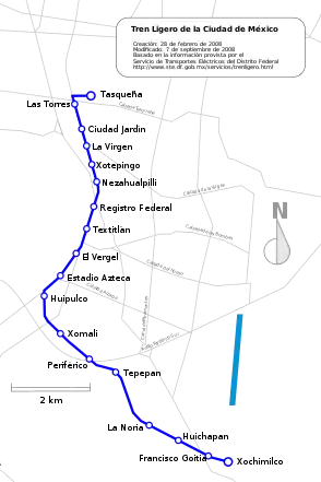 Entre os anos de 1986 e de 1988, a empresa Servicio de Transportes Eléctricos del Distrito Federal, que operava os bondes da Cidade do México, reativou o serviço de bondes do sul da cidade a partir de um projeto denominado Tren ligero. O projeto, elaborado com consultoria da empresa canadense Urban Transportation Development Corporation, reaproveitou o leito das antigas linhas de bondes Tasqueña ↔ Xochimilco e Huipulco ↔ Tlalpan para implementar uma única linha com o uso de veículos leves sobre trilhos (VLTs).