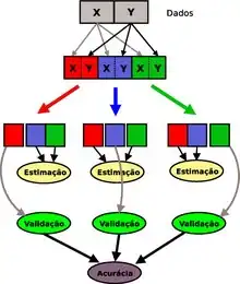 O método de validação cruzada denominado k-fold consiste em dividir o conjunto total de dados em k subconjuntos mutuamente exclusivos do mesmo tamanho e, a partir daí, um subconjunto é utilizado para teste e os k-1 restantes são utilizados para estimação dos parâmetros, fazendo-se o cálculo da acurácia do modelo. Este processo é realizado k vezes alternando de forma circular o subconjunto de teste. A figura abaixo mostra o esquema realizado pelo k-fold.