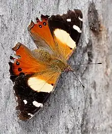 É uma borboleta de tamanho médio, com uma envergadura variável de 48 a 50 mm na Tasmânia,[2] e 48 a 55 mm na Nova Zelândia.[3][4] A parte superior das asas anteriores é marrom escuro a preto em direção às bordas externas, com três pequenas manchas brancas e uma barra amarela larga e brilhante, e vermelho opaco mais perto do corpo. As asas traseiras são de um vermelho fosco com uma borda preta e uma fileira de círculos pretos com centros azuis claros perto da borda.