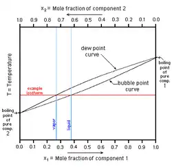 Para um sistema de duas fases (isto é, duas fases líquidas), a pressão de vapor do sistema é a soma das pressões de vapor dos dois líquidos. Na ausência de uma atração forte inter-espécie entre moléculas semelhantes ou diferentes, a pressão de vapor segue a Lei de Raoult, que afirma que a pressão parcial de cada componente é o produto da pressão de vapor do componente puro e sua fração molar na mistura. A pressão de vapor total é a soma das pressões parciais dos componentes.[5]