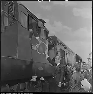 ![]() O governador Natel entrega o bastão de staff ao maquinista do trem inaugural do trecho da Refinaria de Paulínia da Variante Boa Vista-Guedes, 1973. Arquivo Público do Estado de São Paulo | |