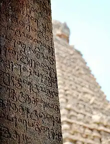 ![]() Inscrições em vattelluttu no templo de Brihadisvara, em Thanjavur. O mesmo foi construído no século XI, durante a era do império Chola. | |