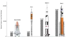 - O Saturn V foi um veículo de lançamento da NASA que fez 12 lançamentos orbitais entre 1967 e 1973, principalmente para o programa Apollo até 1972. A carga útil lunar Apollo incluiu um módulo de comando, módulo de serviço e o Módulo Lunar Apollo, com uma massa total de 45 t.[4][5] Quando o terceiro estágio e o combustível de partida da órbita terrestre foram incluídos, o Saturn V realmente colocou aproximadamente 140 t na órbita terrestre baixa (LEO).[6] O lançamento final do Saturn V em 1973 colocou o Skylab, uma carga útil de 77.111 kg, em LEO.