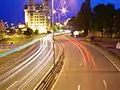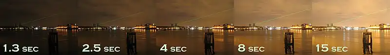 Demonstração em foto noturna de como maiores tempos de exposição influenciam a formação da imagem. Fotografias obtidas com a mesma abertura do diafragma