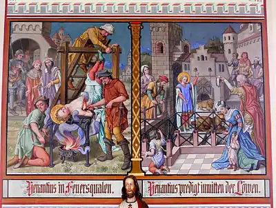 | Atribuições | Jovem crucificado de ponta cabeça com fumaça saindo da cabeça; jovem segurando a cidade de Camerino; jovem segurando a cidade de Camerino, a palma do martírio e um livro; jovem com um estandarte segurando o muro da cidade. |