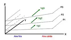 Se houver diferenças de temperatura entre duas massas de ar, o vento geostrófico varia de altitude. Pode-se supor que o vento geostrófico de altura (Vg2 e VG3) é a soma do vento geostrófico inferior (Vg1) com o "vento térmico".