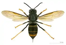 Esta espécie apresenta a cabeça preta com face laranja ou amarelada, o tórax castanho-escuro ou preto, um segmento no abdómen amarelo-alaranjado na parte dorsal, as asas escuras e as patas castanhas com extremidades amarelas.[1]