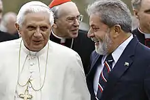 Em 10 de maio de 2007 Bento XVI reuniu com o presidente Lula, que reiterou a sua crença na preservação do Estado laico e nas posições diferentes entre a Igreja e Brasil sobre o aborto. Na parte da tarde, o pontífice falou para cerca de 70 mil jovens a partir de Estádio do Pacaembu em São Paulo (mais de 100 000 outros viram a cobertura do evento a partir do exterior por motivos de segurança) instando-os a ser "construtores de um mundo mais justo e solidário, reconciliado e pacífico".