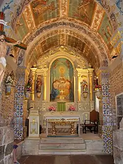 No interior, a capela-mor é decorada com silhar de azulejos de padrão policromo maneirista. O retábulo-mor foi feito num período de transição entre o tardo-barroco e o neoclássico. Os altares colaterais são em talha policroma marmoreada.