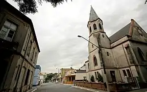 Vista lateral da Escola de Meninos, cruzamento com a rua Irmã Paula Loebemstein