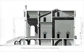 A mudança de programa levou à clausura duma janela termal posterior ainda visível no projecto. Num esboço de estudo acolhe-se, igualmente, uma primeira solução dum pronau com colunas também dos lados, depois substituída pelo actual muro furado por um arco, garantia do fortalecimento da estrutura, segundo o exemplo antigo do Pórtico de Otávia.