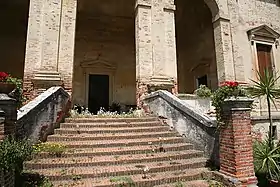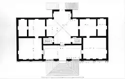 O corpo do edifício assenta numa base, a partir da qual está dividido por meio dum rebordo que corre ao longo de toda a largura da fachada. Por um lado serve para proteger as zonas de trabalho da humidade, mas por outro lado também eleva a villa acima da paisagem circundante. Este uso duma base pode encontrar-se numa série de villas palladianas, mas não foi invenção sua; Giovanni Maria Falconetto colocou a Villa dei Vescovi, em Luvigliano, que foi começada em 1534, sobre uma base.[4]