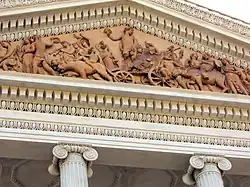 - a Morte de Priamo (da Eneida de Virgílio);[15] também este alto relevo é feito em gesso e foi encontrado na sala de baile da Villa Torlonia.[17] A representação da cena mostra Pirro, filho de Aquiles, que agarra Príamo pelos cabelos no acto de atingir até à morte o seu adversário.[17] O alto relevo, pelo estilo foi aborda o mesmo tema duma escultura do século XV, uma pintura de Gavino Hamilton e alguns vasos gregos[17]