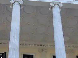 O pórtico liga as duas alas do palácio..[19] A sala é marcada por colunas toscanas em travertino e dá para o exterior mediante portas vidradas[19] Estão ali conservadas duas estátuas: