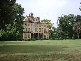 A fachada traseira, de estilo tardo-renascentista, é caracterizada por um grande pórtico de ordem toscana.