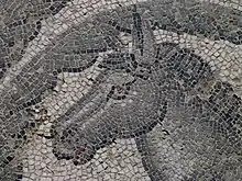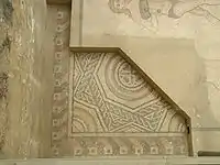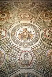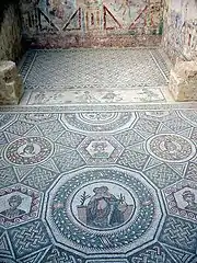 A partir da entrada, alguns degraus conduzem ao vestíbulo: ao centro dum pavimento geométrico, está inserida uma cena parcialmente conservada do advento (chegada) sob dois registos. No registo superior, um homem com coroa de folhas sobre a cabeça e candelabro na mão direita, flanqueado por dois jovens com ramos nas mãos, parecendo esperar a chegada de um hóspede importante. No registo inferior, alguns jovens recitam ou cantam com dípticos abertos nas mãos. Os estudiosos viram aqui uma cena religiosa ou umas boas-vindas solenes para a entrada do proprietário – certamente uma personalidade de relevo – na sua casa.