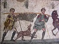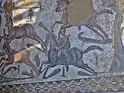- A primeira cena representa a captura de diversos animais, cada um deles parecendo provenientes duma província diferente da África, à excepção da Tripolitânia: a captura da pantera na Mauritânia, segundo a técnica descrita na História Augusta, realizada por soldados (reconhecíveis no mosaico pelo vestuário) com a ajuda dum isco e de uma armadilha; a captura do antílope na Numídia, onde os cavaleiros não fazem uso da sela; a captura do javali selvagem em Bizacena, próximo dum pântano talvez identificável com o Lago Trítone (Lacus Tritonis), a sul do Hadrumeto.