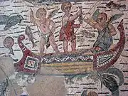 - Na terceira cena, que se encontra frente à entrada da sala absidada, está representada uma linha de terra situada entre os dois mares. Ao centro, um grupo de três personagens observa o desembarque dos animais de dois navios provenientes dos dois lados. Pela sua posição proeminente, neste grupo pretende-se ver a representação de um dos tetrarcas, ou de Magêncio (filho do Maximiano) com dois outros oficiais, ou ainda de um procurador de elefantes (procurator ad elephantos; funcionário imperial encarregue dos animais para os jogos) com dois adidos. A terra entre os dois mares é, com toda a probabilidade, a Itália, e talvez esteja aqui representado o porto da própria cidade de Roma. O desembarque simultâneo dos dois navios constitui um exemplo de narração típica da arte tardo-antiga.