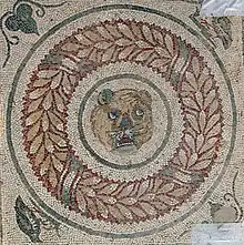 A partir do vestíbulo acede-se ao peristilo: o mosaico apresenta aqui uma série de coroas de louro incluindo cabeças de animais de muitas espécies diferentes (felinos, antílopes, touros, cabras selvagens, cavalos, burros selvagens, cervos, ovelhas, um elefante e uma avestruz). A orientação das cabeças muda em dois pontos: em relação à entrada do vestíbulo e à base da escada de acesso ao complexo da sala absidada do lado oriental. Esta mudança tinha, provavelmente, a função de enfatizar os dois itinerários percorríveis no interior do edifício: o privado, à esquerda da entrada, que conduzia às salas do lado setentrional, e o público, em direcção à sala absidada do lado este e ao núcleo do triclínio com peristilo oval.