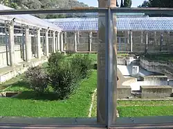 O pátio em forma de ferradura é circundado por colunas em mármore com capitéis jónicos, enquanto ao centro estão os restos duma fonte quadrada. Do pavimento original, conserva-se, ao longo do lado norte do pátio, uma cavala de mosaicos bicolores com decoração nas escamas.