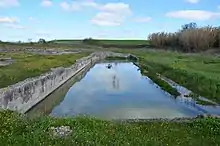 A uma distância de cerca de 200 m da villa foi descoberto o paredão de uma barragem, que servia para fornecer a casa e a exploração agrícola e pecuária.[2] Com efeito, a casa possuía várias estruturas que aproveitavam o abastecimento de água, como a zona das termas e vários grandes tanques e piscinas.[10] Esta estrutura estava situada na Ribeira da Chaminé, formando uma albufeira com 340 m de comprimento e uma área inundada de 31300 m², e uma capacidade máxima de 38 mil m³ de água.[10] A barragem foi mencionada por Abel Viana em 1947, que descreveu o paredão como tendo 58 m de comprimento, uma altura máxima de 4,3 m e uma espessura de 3,0 m.[10] O autor descreveu a barragem como sendo composta por pequenos blocos de diorito e outras rochas unidas com argamassa, em opus incertum, tendo sido organizadas em forma de cutelo e calçadas com pequenas lascas, de forma a aumentar a sua resistência contra a força da água.[10] A parte em opus incertum é composta por blocos de pequenas dimensões com argassama, sendo coberta por blocos maiores, cimentados e organizados em filas de forma aproximadamente horizontal.[10] Uma análise pormenorizada do paredão revela duas características importantes, sendo uma delas a existência de descontinuidades horizontais tanto no núcleo como no paramento a jusante, mostrando que ambas as partes foram construídas ao mesmo tempo.[10] A segunda é a presença de dois furos na base do paredão, um deles formando um arco de volta inteira com aparelho em tijoleira, e que seria provavelmente uma descarga de fundo, enquanto que o outro terá sido provavelmente aberto após a ocupação romana.[10] Abel Viana também descreveu a presença de moinhos de água, que utilizariam a força da água.[10] Ao longo dos séculos, a barragem sofreu um profundo processo de assoreamento, verificando-se uma grande diferença de cerca de três metros entre montante e jusante.[10] A villa romana também era abastecida por um poço de alvenaria de pequenas dimensões, situada no interior da casa, e que serviria muito provavelmente para as tarefas domésticas.[11]