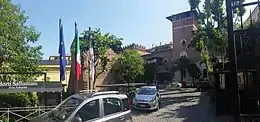 Vista da fachada anterior e a entrada para o parque arqueológico dos Jardins Salustianos.