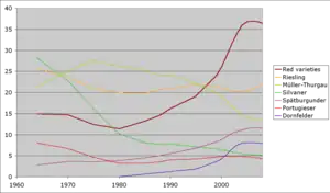 No total, cerca de 135 variedades de uvas podem ser cultivadas na Alemanha - 100 são liberadas para a produção de vinho branco e 35 para a produção de vinho tinto. De acordo com a imagem internacional, a Alemanha ainda é considerada uma região para a produção de vinho branco. Desde a década de 1980, a demanda por vinho tinto alemão tem aumentado constantemente, o que resultou em uma duplicação dos vinhedos usados para vinho tinto. Atualmente, mais de 35% dos vinhedos são cultivados com uvas tintas. Algumas das uvas tintas também são usadas para produzir rosé.