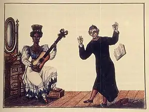 Violões já eram frequentes no Brasil na primeira metade do século XIX, figurando na iconografia da época, como na gravura anônima "Negra ao violão, padre dançando" (pertencente a uma colação particular) e na gravura de Nachtmann, Spix e Martius intitulada "Festa da Rainha in Minas" (1823-1831). A literatura do período também apresenta indícios da popularização da viola e da adoção do violão pela elite brasileira, especialmente no Rio de Janeiro.[31] Por outro lado, há uma certa confusão no Brasil entre as designações viola e violão no século XIX,[32] acarretada, entre outros fatores, pelo uso português da expressão viola francesa para designar o instrumento que no Brasil é denominado violão, o que torna necessário bastante cuidado na interpretação da documentação desse período sobre tais instrumentos.[33]