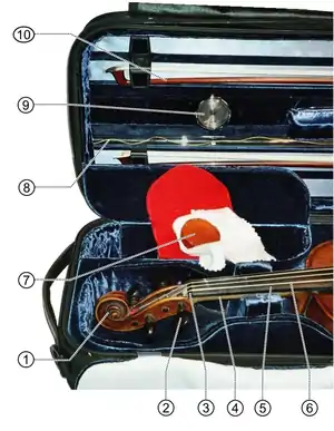 - Queixeira: Peça anatômica que serve para o violinista acomodar de maneira mais confortável o violino ao maxilar. Foi inventada pelo alemão Ludwig Spohr.