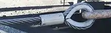 Um cabo de aço terminado com uma virola (esquerda) e um dedal (direita)