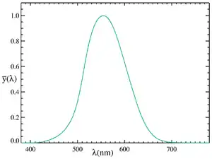 A sensibilidade do olho humano em visão fotópica não é a mesma para todos os comprimentos de onda (ver quadro abaixo), atingindo a sua máxima sensibilidade em torno dos 555 nanometros. O olho humano usa três tipos de cones para identificar três cores fundamentais. Os pigmentos biológicos existentes nos cones têm valores máximos de absorção da luz nos comprimentos de onda de 420 nm (azul), 534 nm (verde-azulado) e 564 nm (amarelo-esverdeado). A sua gama de sensibilidade sobrepõe-se para permitir visão em todo o espectro visível. A eficácia máxima de absorção é de 683 lumens/W no comprimento de onda de 555 nm (verde).[1]