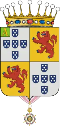 Sousa do Prado (pleno e com diferença nos esmaltes): I e IV - de prata com cinco escudetes de azul postos em cruz, carregados de cinco besantes de prata postos em aspa; II e III - de ouro, com leão de vermelho armado e lampassado de azul; diferença pessoal: Brica de verde carregada com a letra "A" de ouro. Coroa de Visconde. Medalha da Imperial Ordem da Rosa.