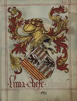 As armas dos de Lima modernas ou dos Viscondes de Vila Nova de Cerveira como se apresentam no Livro do Armeiro-Mor de 1509 eram: esquartelado: I e IV de prata, com um leão de púrpura; II e III de prata, com três faixas xadrezadas de ouro e vermelho de quatro tiras, carregadas de um filete negro em faixa; flanqueado em pala, à dextra, de ouro, com quatro palas de vermelho.[2] Timbre: o leão do escudo.