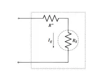 O resistor adicionado também é considerado como um “divisor de tensão”, pois a tensão entre os terminais fica dividida entre o galvanômetro e o resistor como mostrado na imagem abaixo, considere R’’ como o resistor adicionado e Rg o galvanômetro.