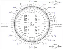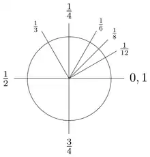 Outra unidade comum para representar ângulos é o radiano, que geralmente é expresso em termos de π (pi). O símbolo π, que representa meia volta, foi desenvolvido por William Jones em 1706 e depois popularizado por Leonhard Euler.[3][4] Em 2010, Michael Hartl propôs usar em vez disso o símbolo τ (tau), igual a 2π e correspondendo a uma volta completa, para uma maior simplicidade conceitual.[5] Essa proposta inicialmente não obteve ampla aceitação na comunidade matemática,[6] mas a constante se tornou mais difundida,[7] tendo sido adicionada a várias linguagens de programação e calculadoras importantes.