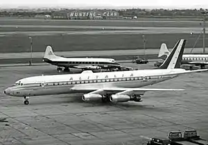 Na década de 1950, surgiriam os primeiros aviões comerciais a jato. Enquanto na Europa o Comet e o Caravelle iniciavam seus voos, nos Estados Unidos, a Boeing trabalhava no projeto do 707. Para não perder mercado, a Douglas Aircraft, que até então era líder no mercado de aeronaves a pistão, resolve iniciar o projeto do DC-8. O primeiro jato voaria em 30 de maio de 1958, poucos meses após o primeiro voo do Boeing 707. Esse atraso custaria à Douglas a perda do domínio do mercado de aviões a jato. Seriam construídos 556 DC-8 entre 1958 e 1972, que seriam utilizados por diversas empresas aéreas para transportar passageiros e, posteriormente, carga. Em 2013 existiam apenas 31 Douglas DC-8 a voar no mundo, exercendo a função de transporte de carga.[2]
