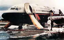 A aeronave saiu da pista por uma pequena pista de taxi chamada "D" e parou apontada para o noroeste.[1] Os esforços de evacuação começaram imediatamente, mas várias dificuldades foram encontradas. O chefe de cabine, que era o comissário de bordo mais antigo da tripulação, tentou abrir a porta de saída dianteira direita cerca de dez segundos antes de a aeronave parar, mas ela travou devido a uma falha no sistema de emergência e ele abandonou as tentativas de abri-la.[1] Após cerca de 25 segundos, o comissário abriu a porta dianteira esquerda e liberou com sucesso a rampa de escape. Neste momento, os dois primeiros caminhões de bombeiros chegaram. Um deles começou a molhar a fuselagem e jogar espuma na porta que estava aberta para evitar que o fogo se espalhasse para a porta e para o escorregador, enquanto os passageiros se evacuavam, e para fornecer resfriamento aos passageiros que ainda estavam dentro da aeronave.