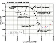 O gravador de voz da cabine (CVR) gravou o capitão pedindo licença para ir ao banheiro, seguido 30 segundos depois pelo primeiro oficial dizendo em árabe egípcio "Tawkalt ala Allah", que pode ser traduzido como "Eu confio em Deus". Um minuto depois, o piloto automático foi desligado, seguido imediatamente pelo primeiro oficial dizendo novamente: "Eu confio em Deus." Três segundos depois, os aceleradores de ambos os motores foram reduzidos para marcha lenta e ambos os profundores foram movidos 3° nariz para baixo. O primeiro oficial repetiu "Eu confio em Deus" mais sete vezes antes de o capitão perguntar repetidamente, "O que está acontecendo, o que está acontecendo?" [4]