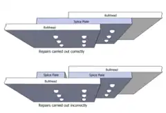 - 2. O reparo subsequente do anteparo não estava em conformidade com os métodos de reparo aprovados pela Boeing. Para reforçar um anteparo danificado, o procedimento de reparo da Boeing exige uma placa de emenda contínua com três fileiras de rebites.[23] No entanto, os técnicos da Boeing que executavam o reparo usaram duas placas de emenda paralelas à rachadura por estresse.[24][25] Cortar a placa dessa maneira enfraqueceu a eficácia de uma das fileiras de rebites, reduzindo a resistência da peça à fissura por fadiga para cerca de 70% da mesma para um reparo correto. Durante a investigação, a Comissão de Investigação de Acidentes calculou que esta instalação incorreta falharia após aproximadamente 10 000 ciclos de pressurização, e a aeronave realizou 12 318 voos bem-sucedidos a partir do momento em que o reparo defeituoso foi feito quando o acidente ocorreu.[4]