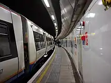 Trem subterrâneo de Londres na plataforma norte da estação Wapping em 2015. As plataformas estreitas e curvas da estação foram identificadas como um risco à segurança.