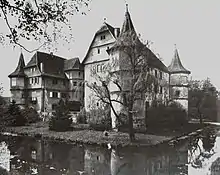 A história remonta ao século XIV, época das menções mais antigas sobre uma edificação antecedente ao Wasserschloss no mesmo local.[4] Por volta de 1525, durante a Guerra dos Camponeses, a antiga edificação foi destruída. Após o fim da guerra, o Barão Peter von Mentzingen (1498-1565) promoveu sua reconstrução com um projeto maior e mais robusto que o anterior, em estilo renascentista, cercado por um fosso de água. As obras se estenderam de 1529 a 1539.[4] O novo castelo durou mais de quatrocentos anos até ser bombardeado em 2 de abril de 1945 pelos Aliados da Segunda Guerra Mundial. Outras edificações que faziam parte do complexo e não foram afetadas pelo bombardeio ainda são mantidas e preservadas pela família, incluindo as ruínas do castelo Wasserschloss. [1] [2] [4]