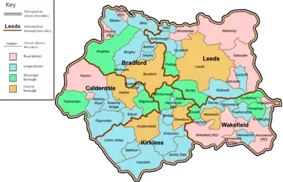 O município teve inicialmente uma estrutura de dois níveis de governo local com um conselho do condado de nível estratégico e cinco distritos fornecendo a maioria dos serviços.[6] Em 1986, os conselhos municipais metropolitanos foram abolidos em toda a Inglaterra. As funções destes conselhos foram transferidas para os municípios; Comitês conjuntos que cobrem bombeiros, polícia e transportes públicos, e outros acordos conjuntos especiais.[7] Organizações como West Yorkshire Police Authority (Autoridade Policial de West Yorkshire) e West Yorkshire Passenger Transport Executive (Transporte Executivo de Passageiros de West Yorkshire) continuam operando nestas bases.