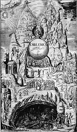 O longo poema de Wither na gravura afirma que seu simbolismo aparentemente inconsistente revelou, sem querer, uma verdade mais profunda. A parte inferior do frontispício mostra pessoas vagando em confusão em uma caverna, aparentemente tendo emergido de uma piscina em forma de útero, na qual bebês são mostrados nadando. Eles saem da caverna para desenhar lotes dados a eles pela deusa da fortuna, simbólicos de seu lugar na vida. Eles então escalam uma montanha, que se divide em dois picos, simbólicos dos caminhos certos e errados da vida. O caminho para o pico à direita parece mais atraente a princípio, mas depois se torna rochoso e, finalmente, leva apenas à morte; o caminho da esquerda é a princípio mais difícil, mas eventualmente se torna agradável e leva ao paraíso. Uma igreja cristã é mostrada à esquerda e um templo pagão à direita.