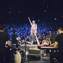 Em novembro, Miley viajou para a Europa para interpretar a canção no MTV Europe Music Awards de 2013 em Amsterdã no dia 10; a apresentação recebeu atenção pública pelo momento na qual ela fumou cânabis no palco enquanto aceitava o prêmio de Melhor Vídeo pela música.[70] Em 17 do mesmo mês, ela cantou no The X Factor em Londres.[71] Depois de ser criticada por entregar uma performance vocal "sem brilho",[72] Cyrus foi posta em um "repouso vocal" por seus médicos, em uma preparação para a Bangerz Tour.[73] Durante sua viagem, ela ainda atuou com a composição no Wetten, dass..? na Alemanha (9 de novembro),[74] no Live Lounge da BBC Radio 1 em Londres (12 de novembro)[75] e no Bambi Awards de 2013, também na Alemanha (14 de novembro).[76] No dia 24 do mesmo mês, a artista fez uma performance da música no American Music Awards de 2013; um gato digitalmente animado foi projetado na tela atrás dela e dublou a faixa junto a ela.[77] Em dezembro, ela apresentou-se nos concertos do Jingle Ball em Los Angeles (KIIS-FM Jingle Ball), Saint Paul, Atlanta, Nova York, Washington D.C., Tampa e Sunrise.[78] Ela também atuou com o material no Dick Clark's New Year's Rockin' Eve with Ryan Seacrest na Times Square em 31 de dezembro.[79] Um episódio do MTV Unplugged estrelando a cantora estreou na MTV em 29 de janeiro de 2014;[80] ela cantou uma versão acústica de "Wrecking Ball", além de diversas outras canções de Bangerz.[81] Mais tarde, no mesmo ano, ela interpretou a faixa durante a Bangerz Tour.[82]
