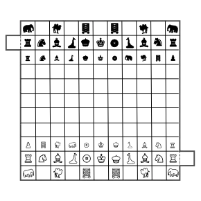 São citadas várias configurações iniciais das peças,[1] sendo a mais comum, da esquerda para a direita: Elefante, vazia, Camelo, vazia, Máquina de Guerra, vazia, Máquina de Guerra, vazia, Camelo, vazia e Elefante. Na segunda fileira, a partir da esquerda: Torre, Cavalo, Piquete, Girafa, General, Rei, Vizir, Girafa, Piquete, Cavalo e Torre. Na terceira fileira, a partir da esquerda: peão dos peões, peão das máquinas de guerra, peão dos camelos, peão dos elefantes, peão dos generais, peão dos Rei, peão dos vizires, peão das girafas, peão dos piquetes, peões dos cavalos e peões das torres. O lado das negras é uma imagem especular das brancas.