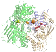 ![]() Xantina oxidase The bounded FAD (red), FeS-cluster (orange), the molybdopterin cofactor with molybdenum (yellow) and salicylate (blue) are indicated. | |||||||