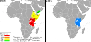 Países que usaram o antigo xelim da África Oriental (à esquerda), países que provavelmente vão adotar o novo xelim da África Oriental (à direita).