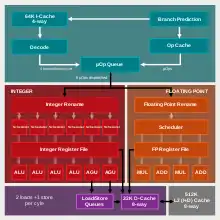 - Cada núcleo SMT pode despachar até seis micro-ops por ciclo (uma combinação de 6 micro-ops inteiros e 4 micro-ops de ponto flutuante por ciclo).[28][29]